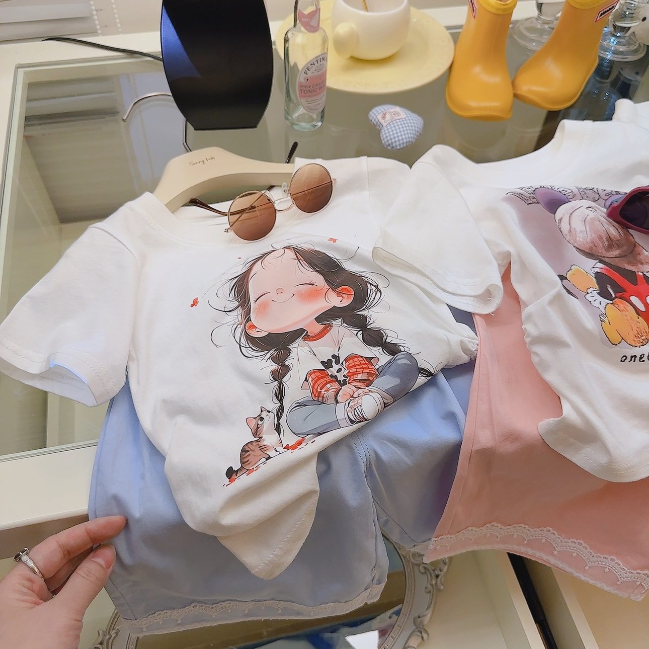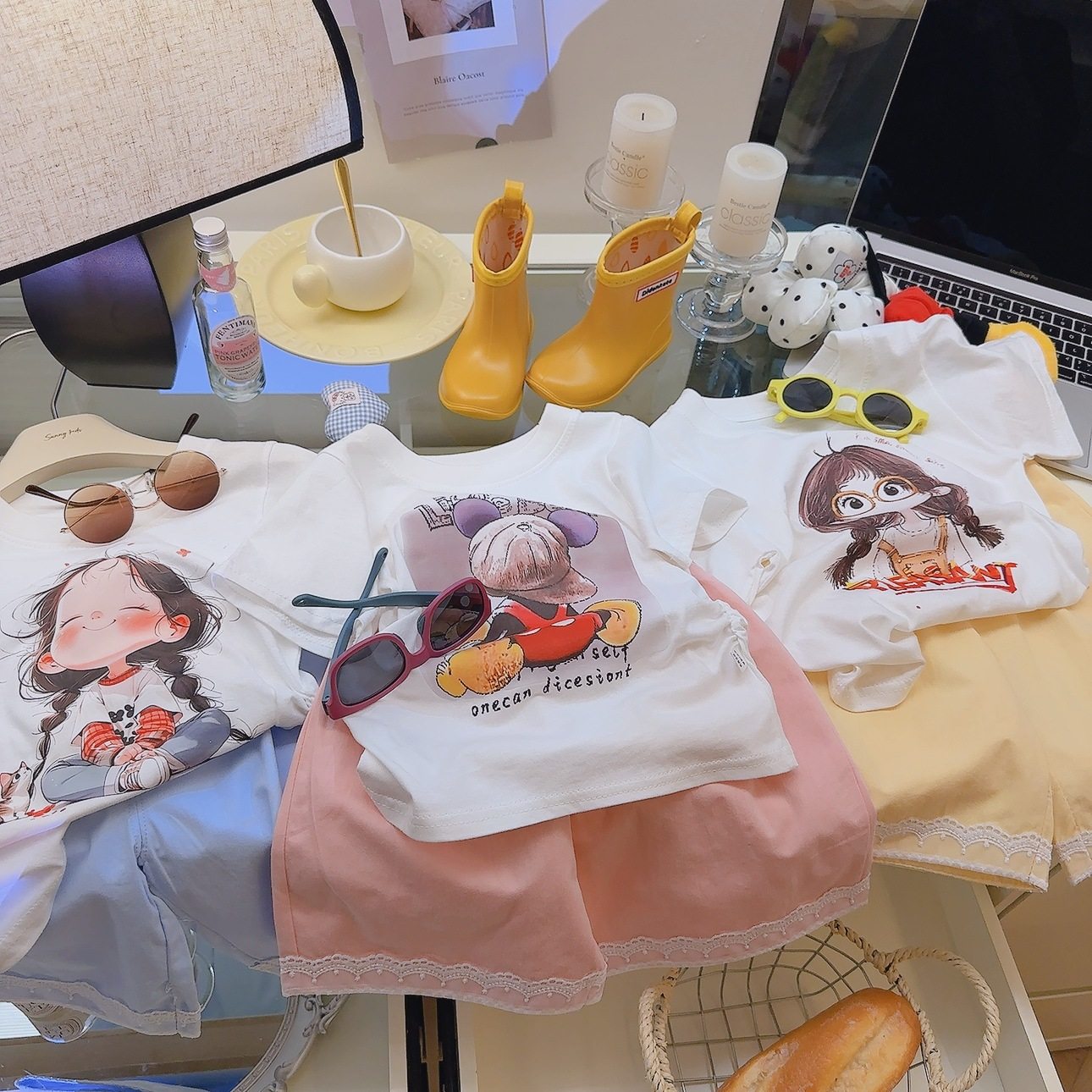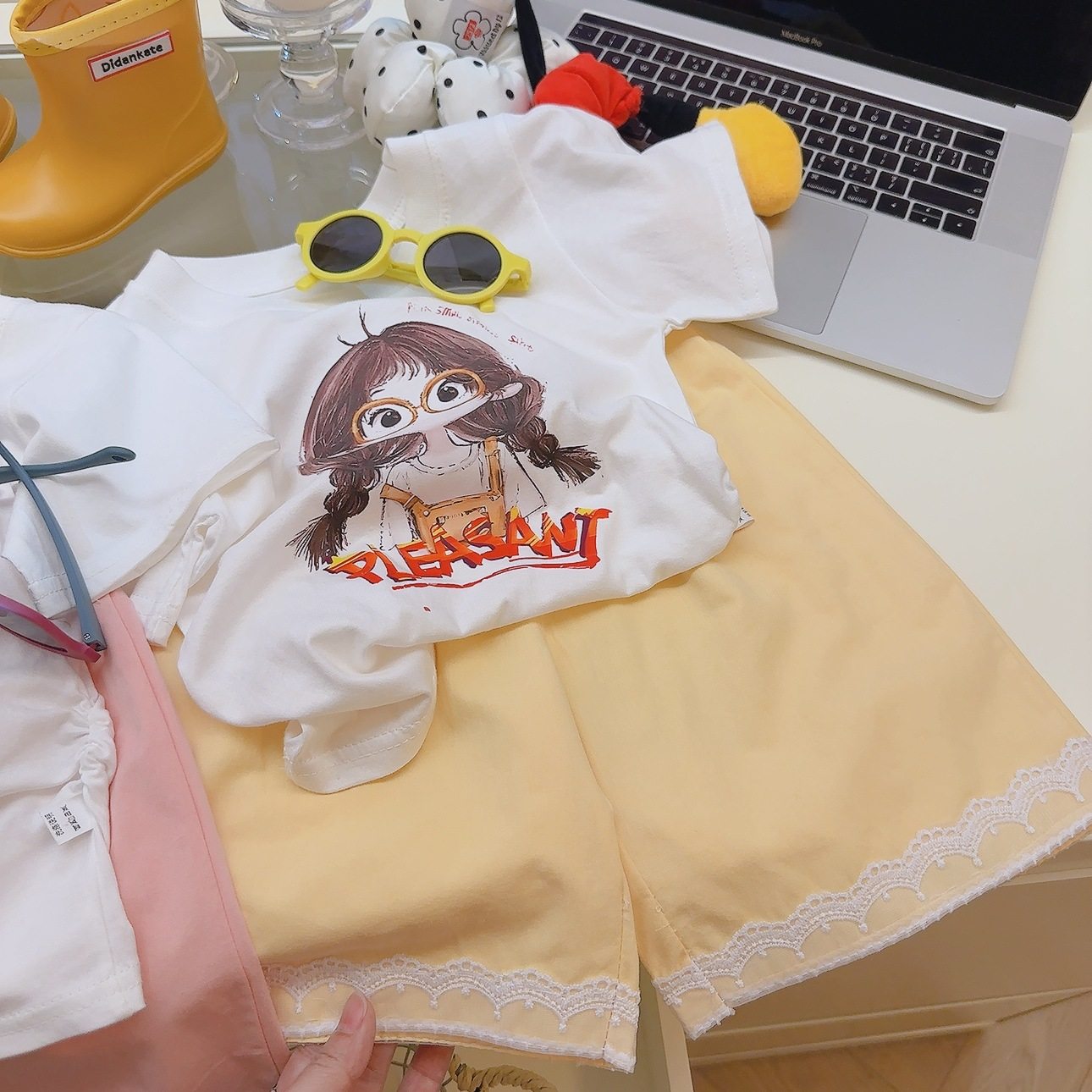 Kaos lengan pendek 100% katun anak perempuan baru musim panas, longgar, dan celana pendek renda katun