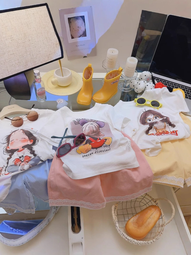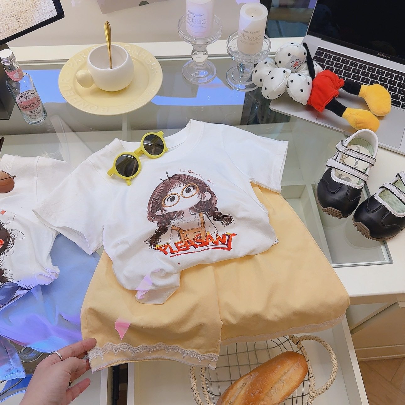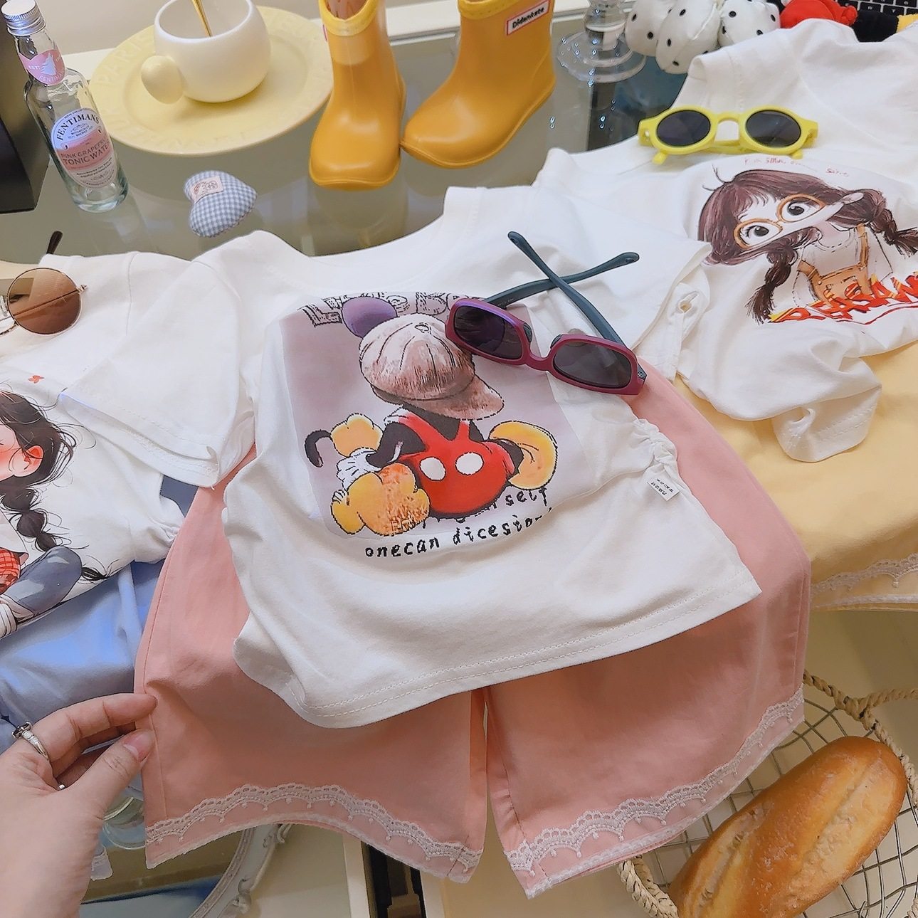 Kaos lengan pendek 100% katun anak perempuan baru musim panas, longgar, dan celana pendek renda katun