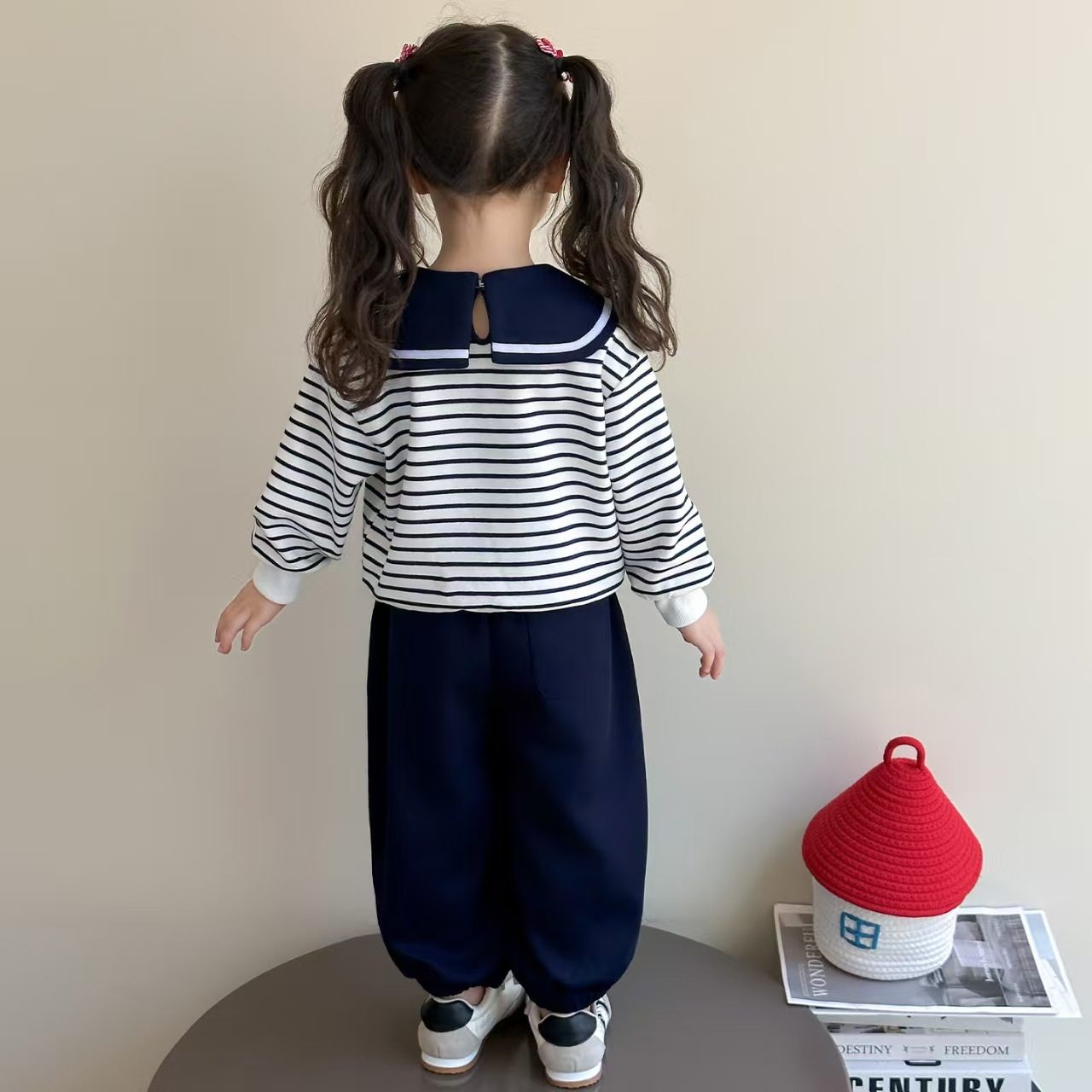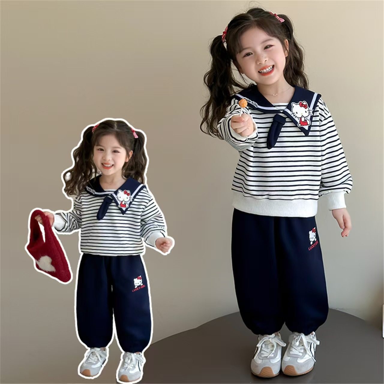 Girls' Autumn Hoodie Set, Kids' Cute Sailor Collar Casual Top, Baby Cartoon Striped Tie Hoodie