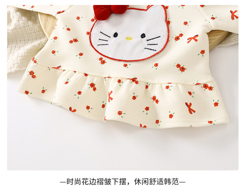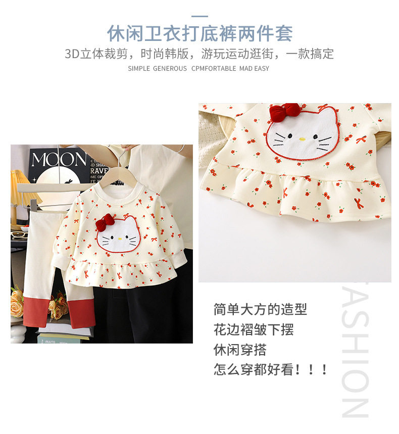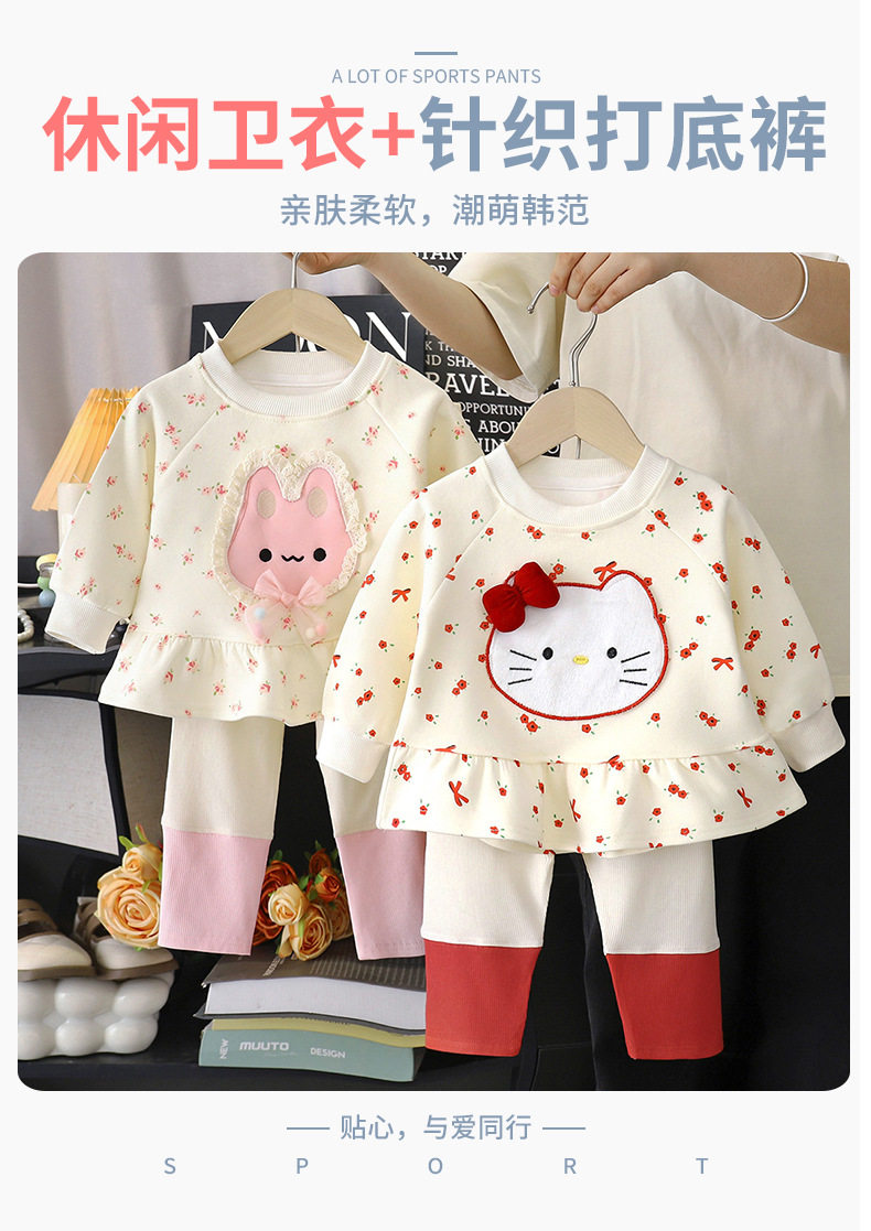 Girls' New Autumn Korean Style Set, Cartoon Hello Kitty Floral Hem Hoodie & Color-Block Leggings, Sweet Outfit
